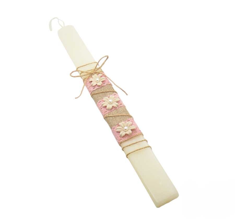 Πασχαλινή λαμπάδα με δαντέλα σε χρώμα σάπιο μήλο και διακοσμητικά λουλούδια. Δίνεται με συσκευασία δώρου.