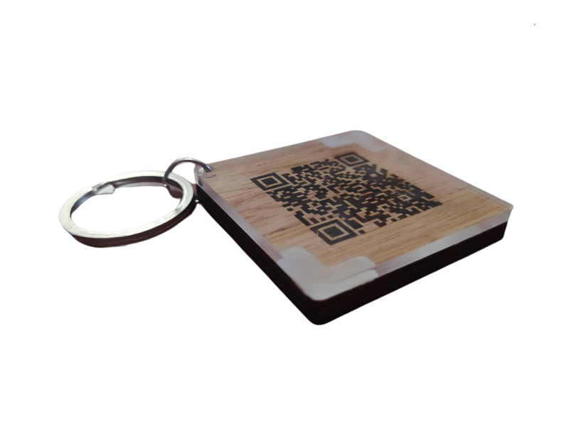 Ξύλινο μπρελόκ με χάραξη του QR κωδικού με κάλυμμα από plexiglass για μεγαλύτερη αντοχή στον χρόνο και στην καθημερινή χρήση. Με διαστάσεις 8 εκ με τον κρίκο και 5 x 5 εκ το ξύλινο με πάχος 7mm. Μπορεί να γίνει και με χρυσό κρίκο.