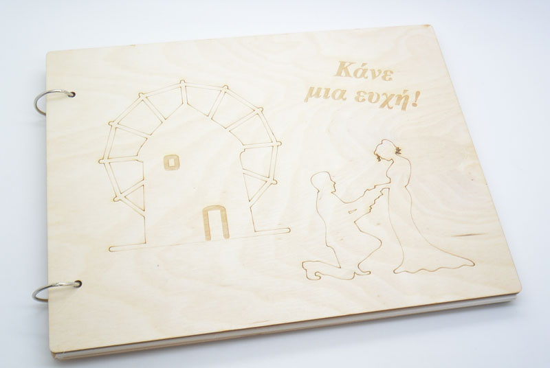 Βιβλίο ευχών γάμου ανεμόμυλος με ξύλινο εξώφυλλο χαραγμένο με laser. Η διάσταση του είναι 28.5 x 22 εκ και περιέχει 30 σελίδες. Μπορεί να χαρακτούν τα ονόματα του ζευγαριού.