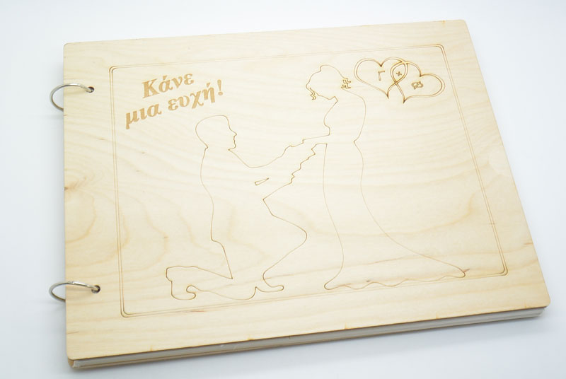 Βιβλίο ευχών γάμου γαμπρός και νύφη με ξύλινο εξώφυλλο χαραγμένο με laser. Η διάσταση του είναι 28.5 x 22 εκ και περιέχει 30 σελίδες. Μπορεί να χαρακτούν τα αρχικά του ζευγαριού.