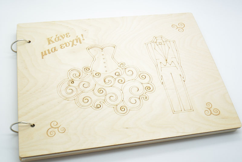 Βιβλίο ευχών γάμου νυφικό και κουστούμι γαμπριάτικο με ξύλινο εξώφυλλο χαραγμένο με laser. Η διάσταση του είναι 28.5 x 22 εκ και περιέχει 30 σελίδες. Μπορεί να χαρακτούν τα ονόματα του ζευγαριού.