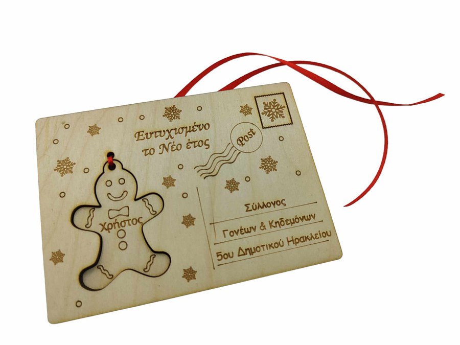 Χριστουγεννιάτικη Αναμνηστική ευχετήρια κάρτα για σχολεία με διάσταση 12.5 x 9.2 cm. Στην κάρτα μπορεί να αναγραφεί η δική σας αφιέρωση. Στο στολίδι μπορεί να γραφτεί το όνομα του κάθε παιδιού. Αφού αφαιρεθεί το στολίδι απο την κάρτα μπορεί να κρεμαστεί στο δέντρο με την κορδέλα που ήδη υπάρχει.