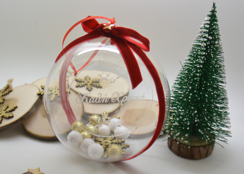 Χριστουγεννιάτικη Διάφανη μπάλα στολισμένη με στοιχείο plexiglass. Διάσταση 12 εκ. Μπορείτε να επιλέξετε την ευχή που θέλετε να χαρακτεί. Δίδεται σε συσκευασία δώρου.
