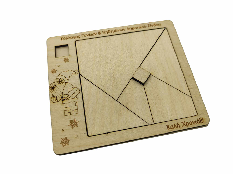 Χριστουγεννιάτικο Ξύλινο παζλ Tangram για σχολεία με αφιέρωση. Διάσταση 14 x 12 cm. Μπορεί να χαρακτεί όποια αφιέρωση θέλετε. Έρχεται έτοιμο μέσα σε διάφανο σακουλάκι.