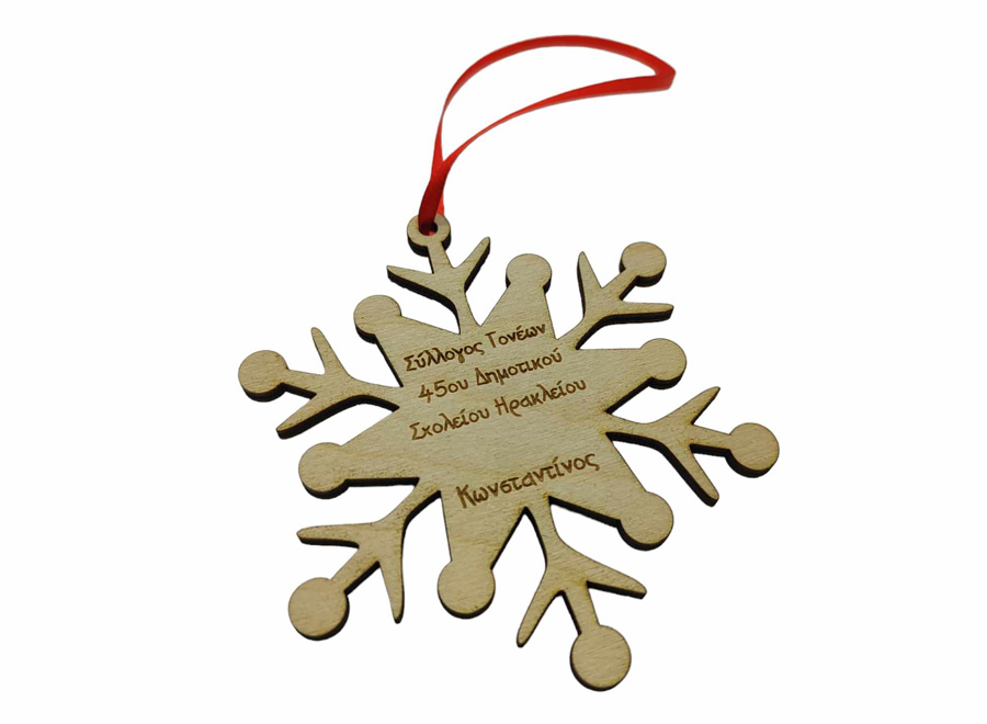 Χριστουγεννιάτικο Στολίδι Χιονονιφάδα για σχολεία με αφιέρωση συλλόγου και το όνομα κάθε παιδιού. Διάσταση ξύλινου 8.5 x 9.5 cm.