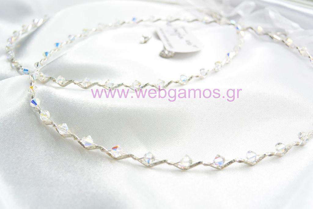 Στέφανα Γάμου ασημένια διαμανταριστά με ιριζέ swarovski. Η τιμή αφορά τα στέφανα, την στεφανοθήκη και 2 μπουτουνιέρες.