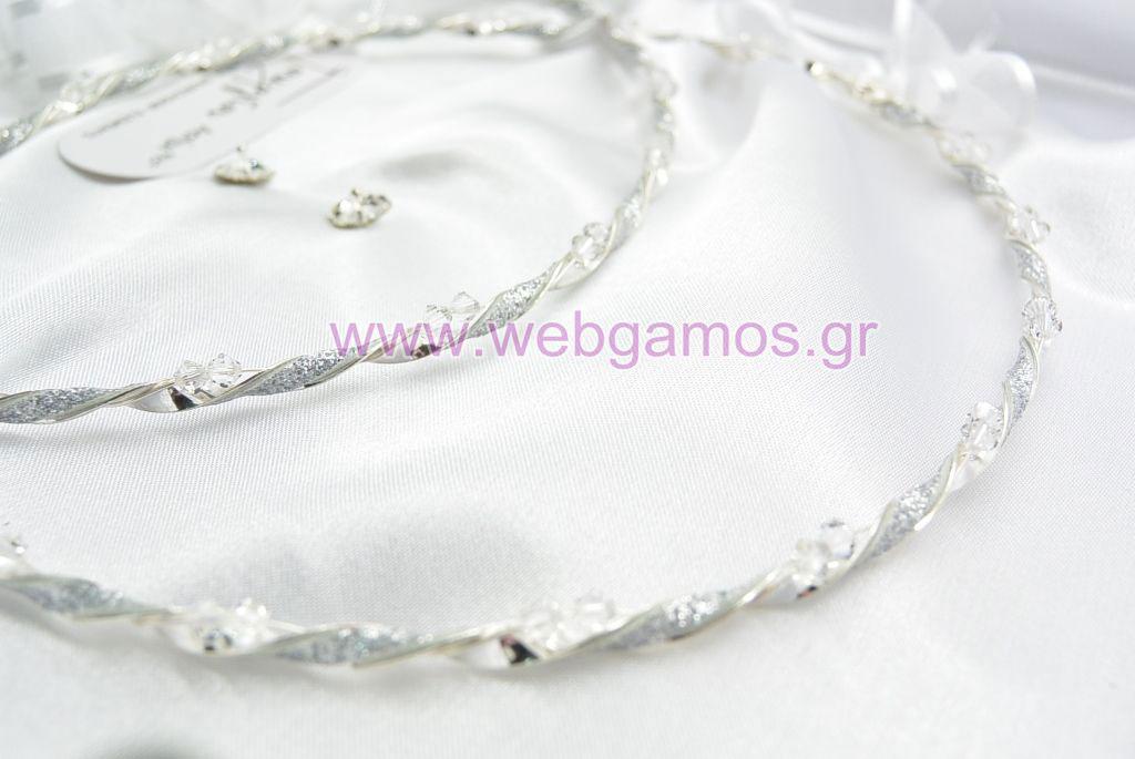 Στέφανα Γάμου ασημένια με δέρμα ασήμι και crystal swarovski. Η τιμή αφορά τα στέφανα, την στεφανοθήκη και 2 μπουτουνιέρες.