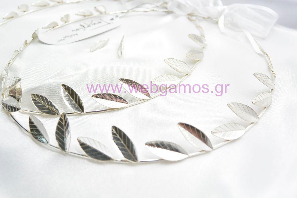 Στέφανα Γάμου ασημένια με φύλλο ελιάς. Η τιμή αφορά τα στέφανα, την στεφανοθήκη και 2 μπουτουνιέρες.