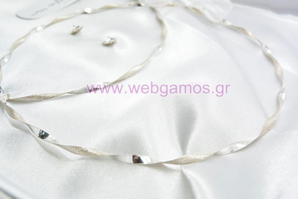 Στέφανα Γάμου ασημένια διαμανταριστά, γυαλιστερά. Η τιμή αφορά τα στέφανα, την στεφανοθήκη και 2 μπουτουνιέρες.