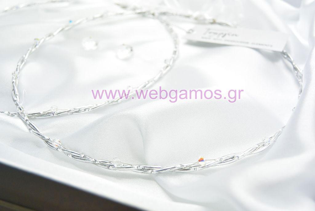 Στέφανα Γάμου επάργυρα και crystal swarovski με σύρμα. Η τιμή αφορά τα στέφανα, την στεφανοθήκη και 2 μπουτουνιέρες.