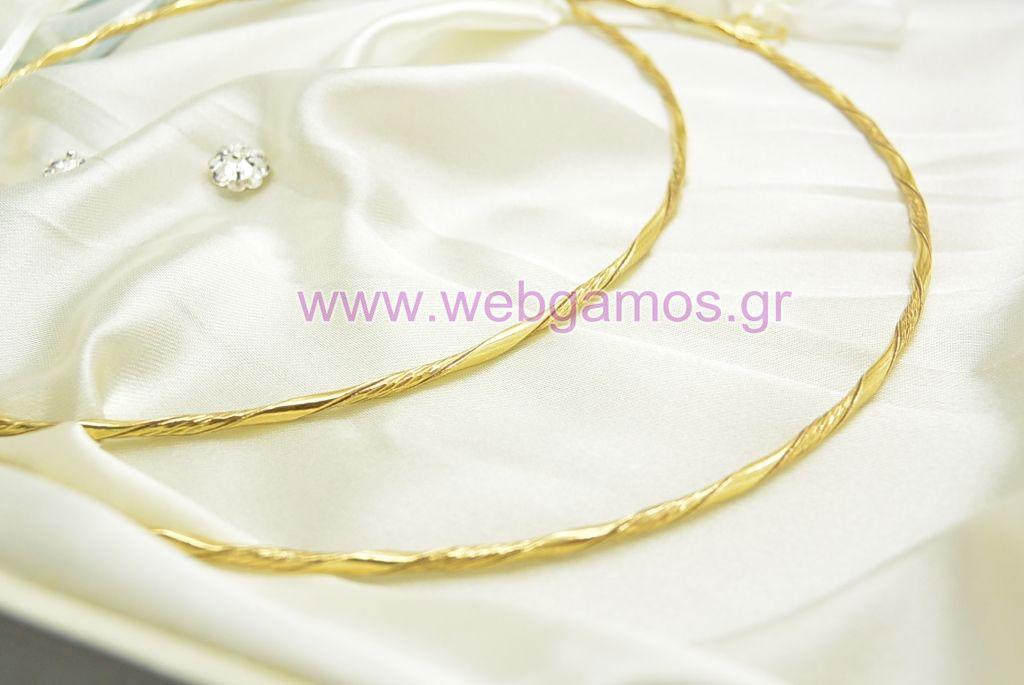 Στέφανα Γάμου επίχρυσα γυαλιστερά σφυρίλατα. Η τιμή αφορά τα στέφανα, την στεφανοθήκη και 2 μπουτουνιέρες.