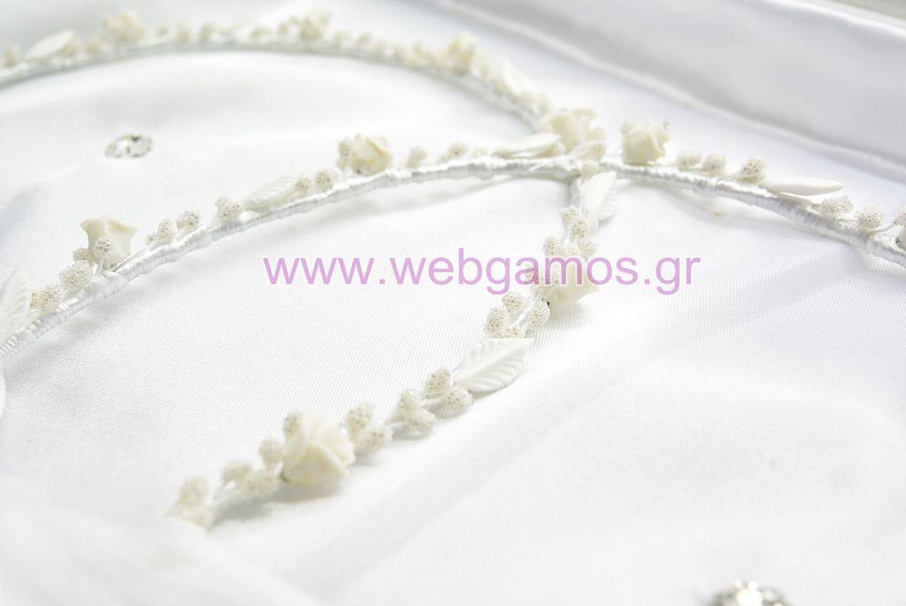 Στέφανα Γάμου πορσελάνινα με strass. Η τιμή αφορά τα στέφανα, την στεφανοθήκη και 2 μπουτουνιέρες.