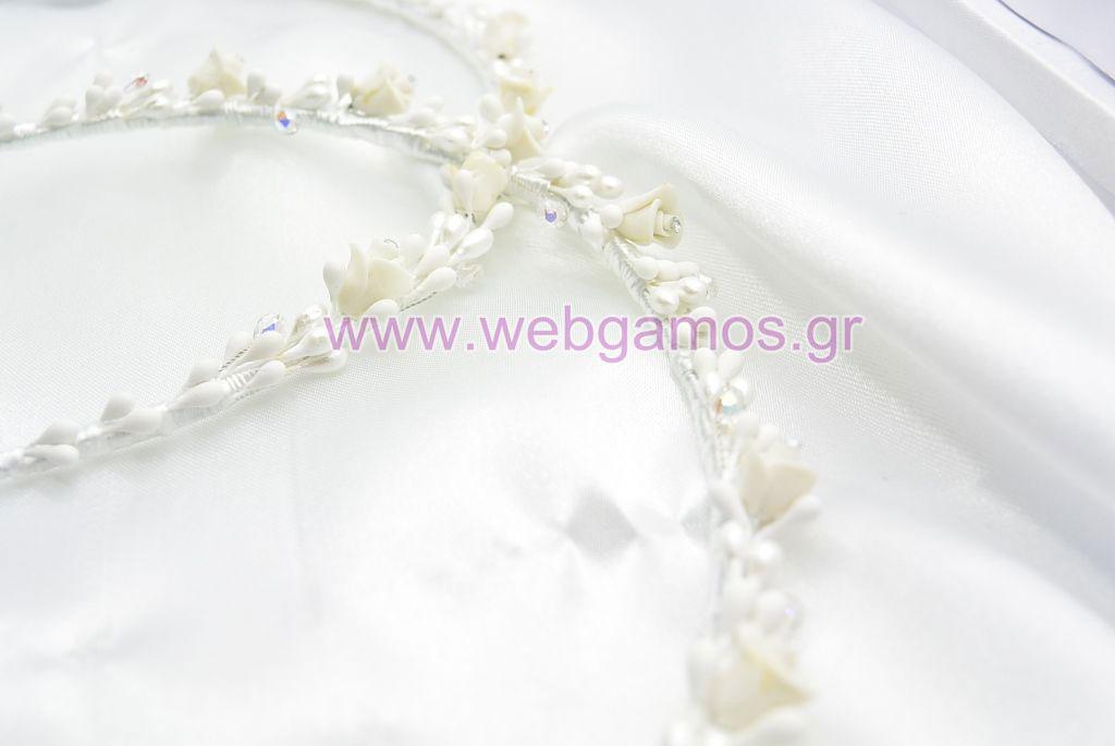 Στέφανα Γάμου πορσελάνινα με strass. Η τιμή αφορά τα στέφανα, την στεφανοθήκη και 2 μπουτουνιέρες.